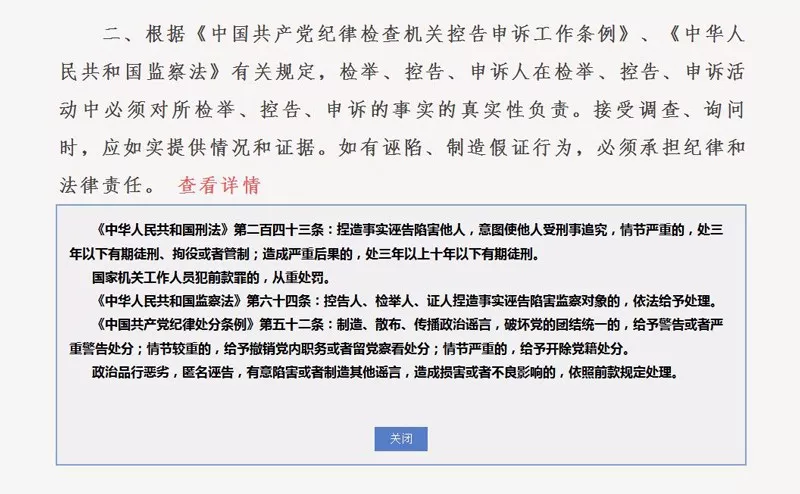 “检举人、控告人、申诉人在检举、控告、申诉活动中必须对所检举、控告、申诉事实的真实性负责……如有诬陷、制造假证行为,必须承担纪律和法律责任。”笔者日前注意到,中央纪委国家监委和地方各级纪检监察机关12388举报网站新增诬告陷害纪法责任提示。